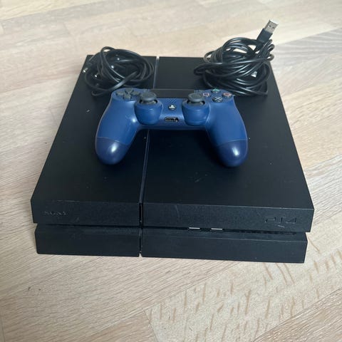 Playstation 4 spillkonsoll slim modell 1TB, med to svarte kontrollere og tilhørende kabler.. konsollen er veldig lite brukt og fremstår som ny.