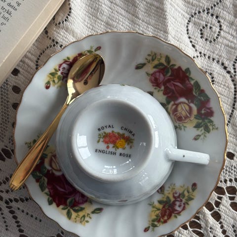 Den har en dekor med rosa roser og blå detaljer med gullkant. Produsert i England.