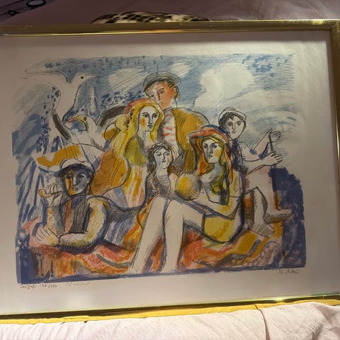 Thorstein Rittun maleri som viser tre kvinner i en fargerik komposisjon. Bildet er innrammet med passepartout og har en signatur nederst. Passer til dekorasjon i hjem eller kontor. 24x24cm