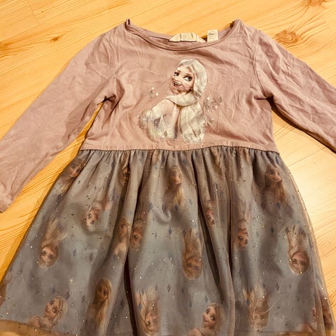 H&M kjole for jente i størrelse 110. Kjolen er rosa og laget av bomull, med lange ermer og Elsa motiv