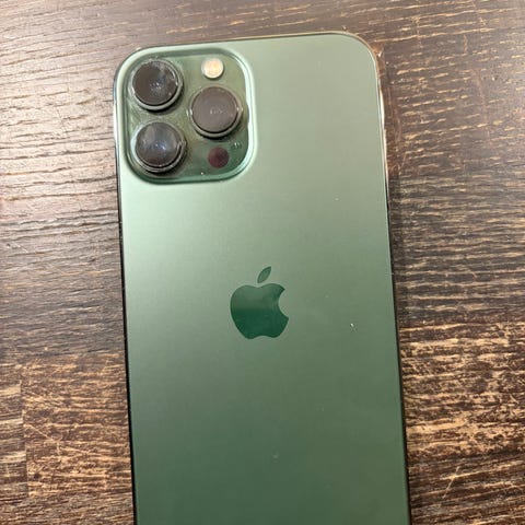 Apple iPhone 13 Pro mobiltelefon med 128 GB lagringskapasitet. Enheten har et kamerasystem med tre linser og en skjerm med kantbeskyttelse. Batterikapasiteten er målt og optimalisert for å forlenge levetiden, med mulighet for redusert ytelse ved lav batterikapasitet. Telefonen leveres med et mobildeksel med mønster.