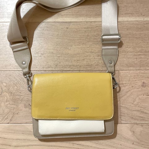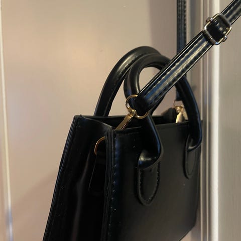 Lekker skulderveske/crossbody-veske i kunstskinn. Regulerbar skulderstropp samt en kort stropp medfølger. Ett rom inni som lukkes med glidelås. Vesken er marineblå og sort. Den måler 21 x 20 x 11 cm. Meget pen og knapt brukt.