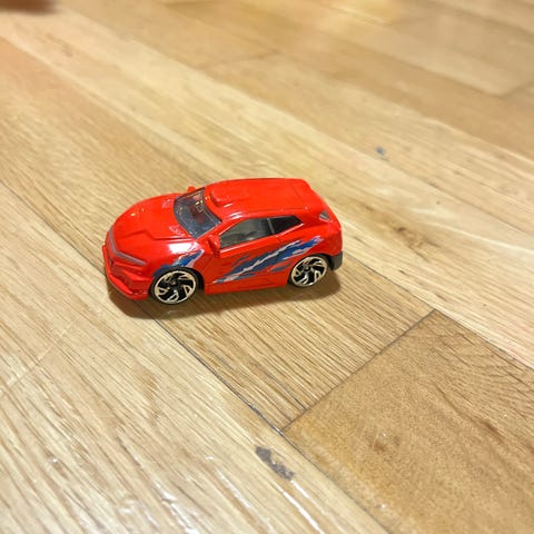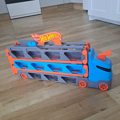 Hot Wheels lastebil leketøysbil i rød farge. Modellen er en lastebil med detaljer som speil og eksosrør. Egnet som leketøy for barn.
