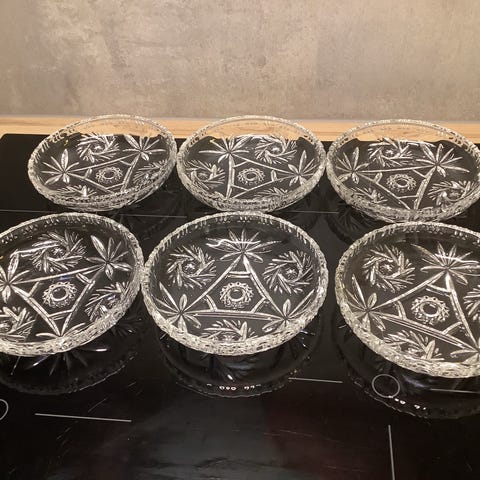 Dessertskåler (6 stk.) fra Walther Komet selges samlet for 450 kroner (høyde 3 cm / diameter 16 cm). K32. Fraktkostnader: PostNord - 69 kroner. Betaling via vipps.