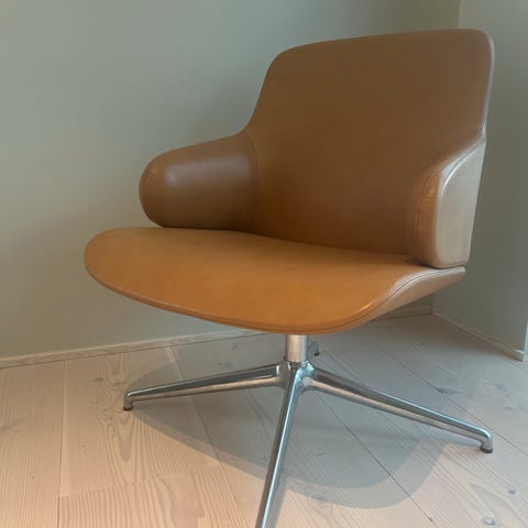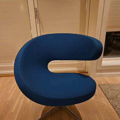 Lenestol med gynge, svingfunksjon og regulerbar nakkestøtte. Stolens organiske form omslutter kroppen og inviterer til avslapning. Produsent Varier Furniture Norway, designer Olav Eldøy. Veldig god sittekomfort. Kjøpt på Kreativ Interiør på Hamar i 2017.