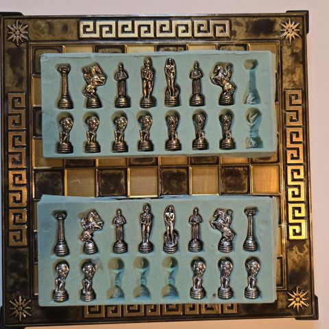 Sjakkbrett med metallbrikker i to farger. Brettet har et dekorativt mønster og en innebygd skuff for oppbevaring av brikker. Passer til sjakkspill og kan brukes til både spill og dekorasjon.