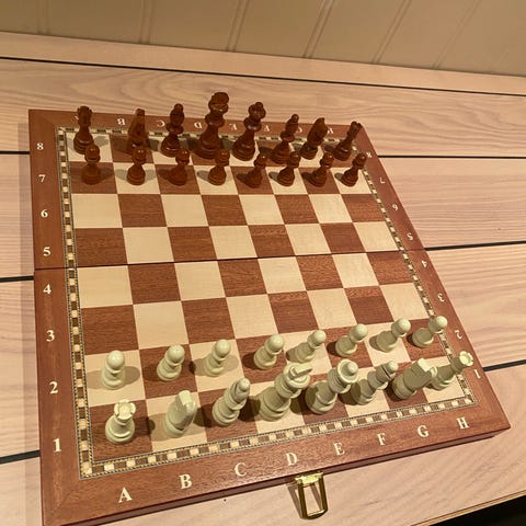 Sjakkbrett med metallbrikker og oppbevaringsskuff