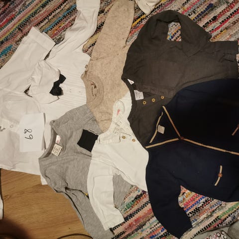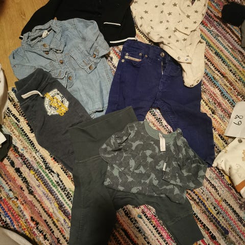 Pent brukte klær i str 68. Den stripete fleecedressen og den mørkeblå jakken er str 74. Alt er kjøpt nytt og brukt av ett barn. Ingen huller eller flekker, kun et lite svakt merke på den lyseblå dressen i teddystoff. Har ikke forsøkt med flekkfjerning, kun vanlig vask. Fra røykfritt hjem uten dyr.
