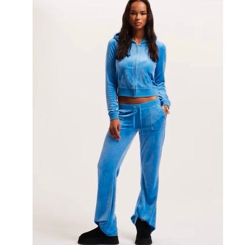 Juicy Couture, veloursett, joggedress, tracksuit, lounge wear, Y2K, 2000-talls stil, flare bukse, lavt liv, rosa velour, designer, merkeklær, jente, ungdom, streetwear, trend, TikTok-trend