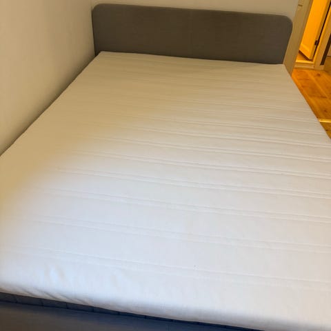 Selger denne 140x200 sengen. Det er en HÖVÅG madrass og en TUDDAL overmadrass. Godt brukt og har en del bruksmerker.