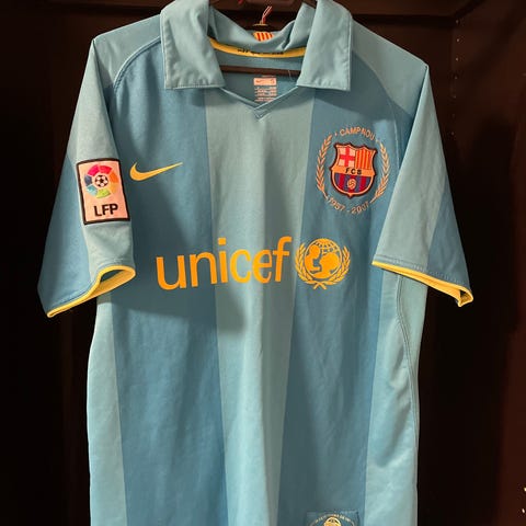 Jeg selger denne bortedrakten til Barcelona fra sesongen 2006-2007 med selveste Ronaldinho 10🇧🇷 bak. Drakten er i Large og i meget god stand, selvfølgelig original (se bilde)