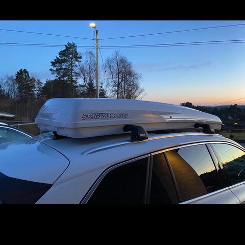 Takboksen er svart og designet for ekstra lagringsplass på taket av kjøretøyet.