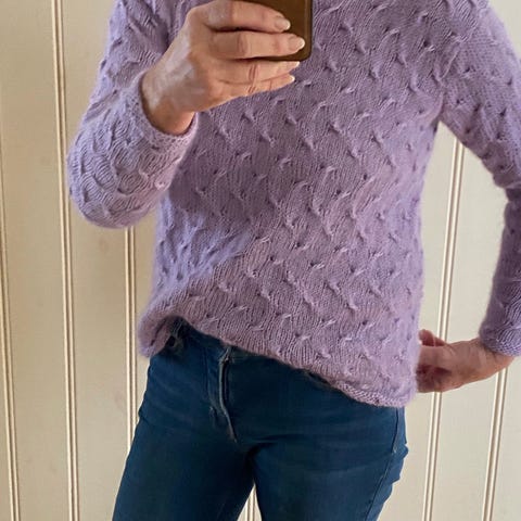 Hjemmestrikket genser selges. Oppskriftfra Petit Knit. I Tynn Silk Mohair fra Sandnes garn. Brukt 2 ganger.