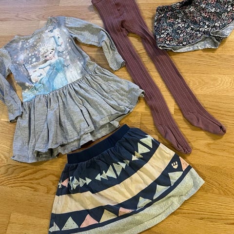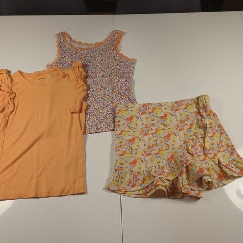 Søt jentebukse. Fin dongeribukse, florlett nesten ny blomstret sommerbukse fra Cubus, Sunniva T-skjorte og en genser med en liten flekk, se bildet. Samlet pris
