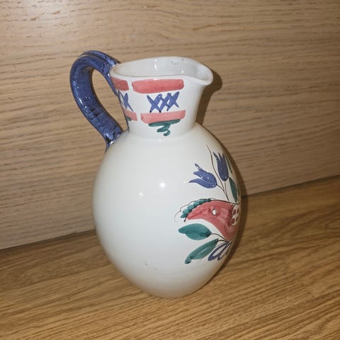 Nydelig Figgjo vase i keramikk med håndmalt dekor av Inger Waage. Merket 1957 under. Den er synlig brukt, og ser ut til å ha en ripe i åpningen. Litt misfarging rett innenfor åpningen. Ellers fin stand! Høyde 14 cm.
