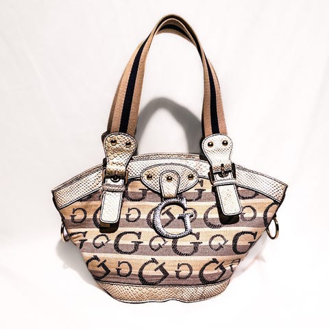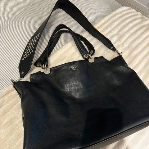 Superlekker og forseggjort Y2K skulderveske fra Guess. Sort kanvas med glitrende og gjenkjennelige G-er. Blått kunstlær med sting-detaljer og nagler. Nydelig glitterfugl, samt bling & logo på låsen. Bred skulderstropp som kan reguleres noe. Kjempekul veske som jeg ikke klarer å yte rettferdighet med bildene mine. Et vintagefunn fra 2000-tallet.