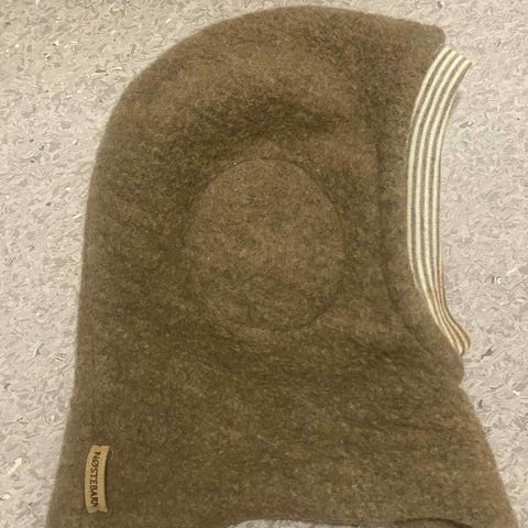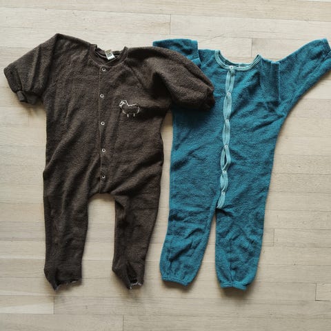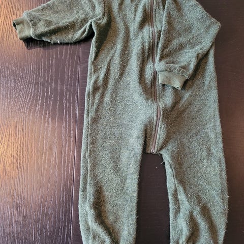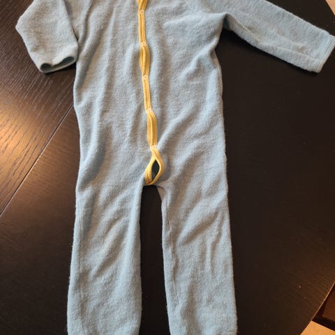 Heldrakt i ull fra Nøstebarn i str 90. Bena er klippet av da sønnen ville ba føttene fri. Slitt på knærne. Selges derfor billig. Nypris ca 950kr.