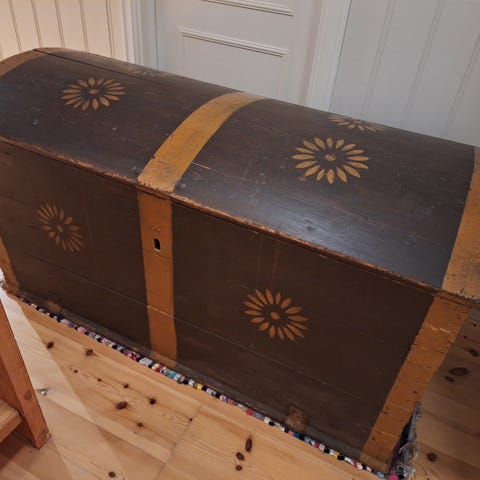 Antikk treskrin med metallbeslag. Skrinet har en buet lokk og dekorative metallbeslag, laget av mørkt tre. Egnet for oppbevaring av ulike gjenstander.