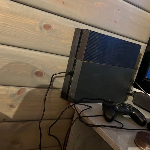 Sony Playstation 4 spillkonsoll i svart farge. Konsollen har en kompakt design og er beregnet for bruk med Playstation 4-spill. Den har standard tilkoblinger for TV.