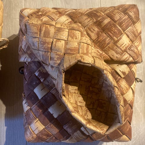 Håndlaget kurv laget av flettet tre. Kurven har en avlang form med håndtak og naturlig trefarge. Egnet for oppbevaring eller dekorative formål.
