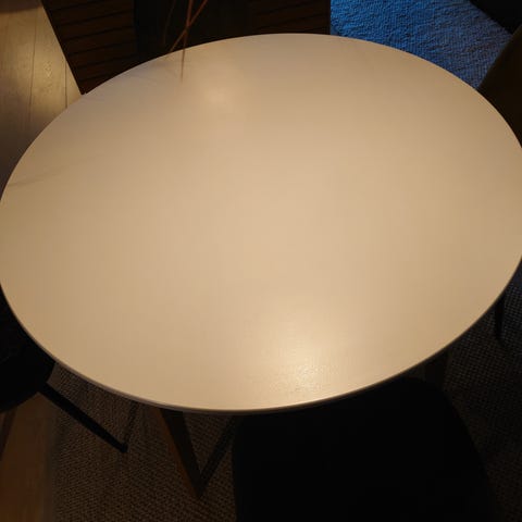 Spisebord diameter 150 cm. Bordplaten og sokkelen er hvite, foten er i sølv/stål. Bordet har noen bruksmerker (se bilder). Bordet oppleves stødig, veier 60 kg. Det er god plass til 6 personer rundt bordet, og grei plass til 8 gode venner. Bordet må hentes.