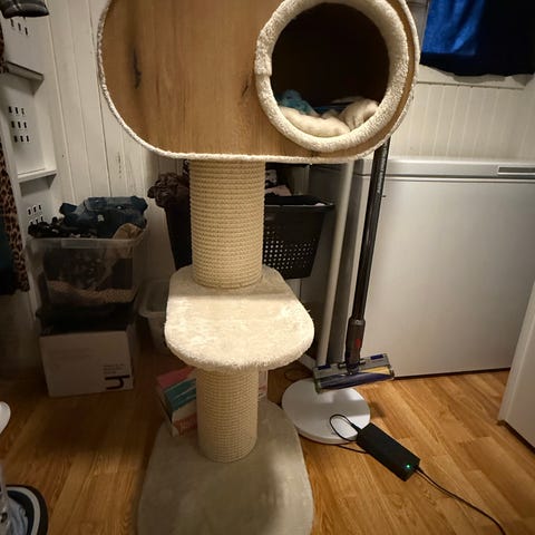 Denne kattesengen syntes jeg er utrolig stilig! Den har blitt brukt et års tid og så satt på lager pga flytting. Har desverre ikke plass til den i den nye leiligheten så prøvdr å selge den så den kan pynte opp og glede en pus i et annet hjem.