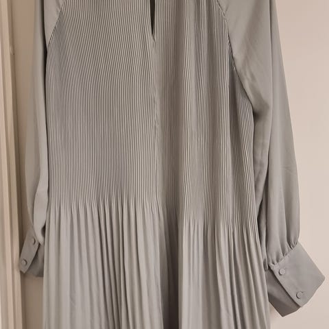 H&M silkekjole i størrelse L. Kjolen har grønn farge og inkluderer belte i livet. Den har lange ermer med knapp ved mansjett og knappelukking foran ved halsen.