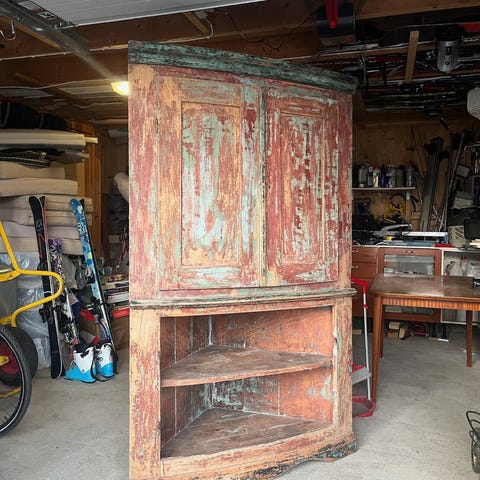 Håndmalt norsk trehjørneskap med tradisjonelle rosemalerier i blått, hvitt, oransje og gult. Skapet har flere rom med dører og skuffer, egnet for oppbevaring av servise og annet kjøkkenutstyr. Inkluderer håndmalt servise med skåler og kasserolle i matchende dekor. Skapet har et dekorativt og funksjonelt design til bruk i kjøkken eller spiserom. Ring eller send mld hvis dere lurer på noe. Selger alt samlet. Kom gjerne med bud.