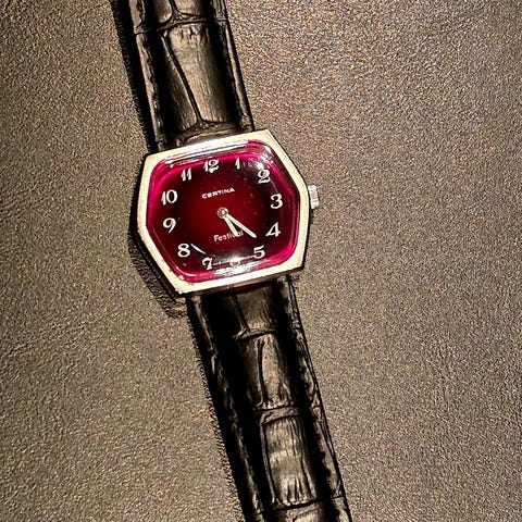 Uret trekkes opp og går, og fremstår som et pent eksemplar med normal brukspatina i tråd med alder. Sølvfarget urskive og gullfarget kasse.