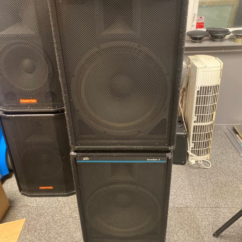 Marshall bærbar høyttaler med innebygd equalizer, flere lydkontroller og hjul for enkel transport. Utstyrt med ulike innganger og utganger for tilkobling av lydkilder. Fungerer fortsatt bra, men har synlige bruksmerker.