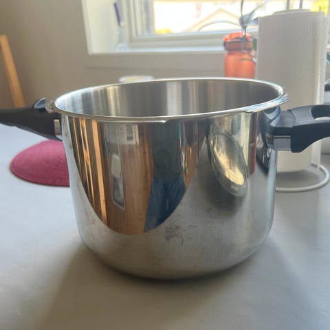 IKEA trykkoker i rustfritt stål. Egnet for effektiv matlaging ved bruk av trykk for å redusere koketid. Inkluderer lokk med sikkerhetsmekanismer og håndtak for enkel betjening.