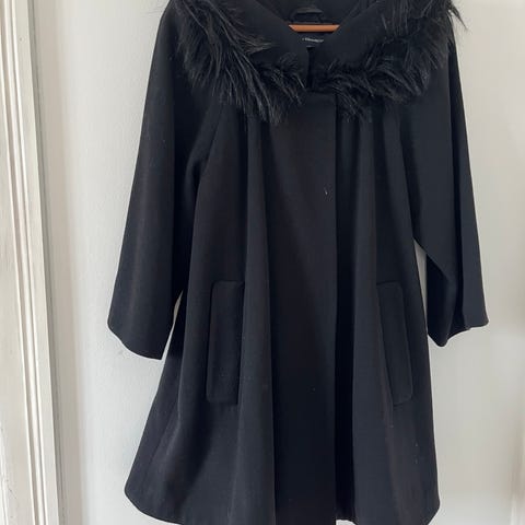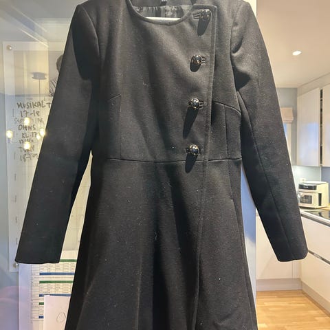 French Connection Annet yttertøy for dame i størrelse S. Jakken er svart og laget av ull. Den har belte i midjen og dobbelspent knappestilling.