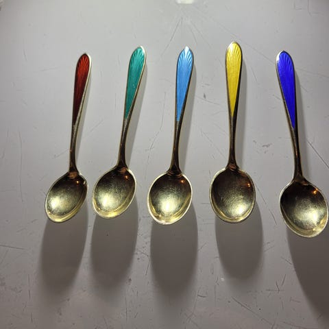 6 stk mokkaskjeer, forgylt og emaljert. Merket 925 sterling