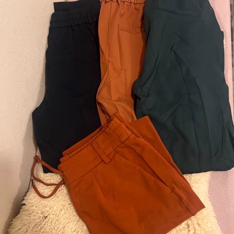 ONLY bukse i størrelse L, grå farge. Buksen har en elastisk midje med knapper og en vid benform, egnet for hverdagsbruk.