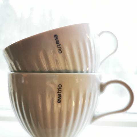 Modern Home Service sett med tallerken og kopper i flere farger. Settet inneholder tallerkener og kopper i blått, oransje og grått.