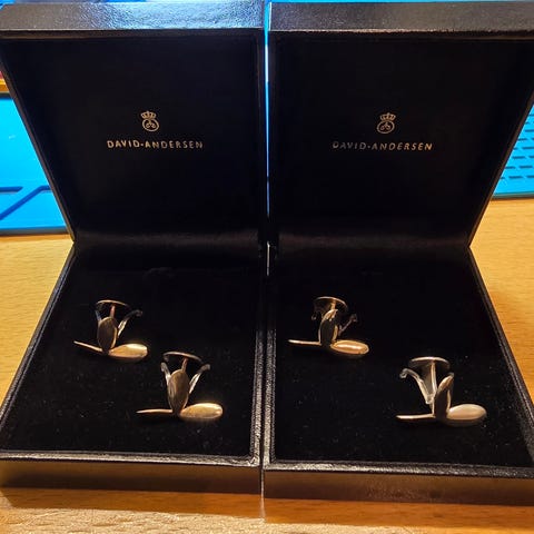 Vintage mansjettknapper i gullforgylt sølv og emalje. Ansvarsmerket David Andersen og Norway sterling. Mål: 20,7 mm x 9,9 mm og veier 11,1 gram.
