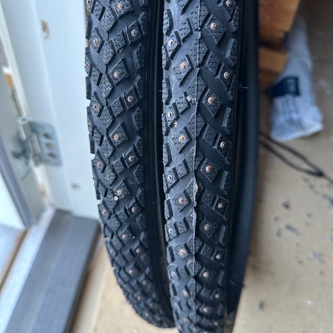Tre piggdekk til sykkel selges. Mål: