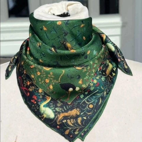 Nydelig silkeskjerf i grønnfarger. Mykt og behagelig. 100%silke. Veldig fin silke i skjerfet, da det er er mulberry silke som er den beste silke kvaliteten. Enkelt å dandere på ulike måter da silken er så fin. Dette er er riktig størrelse om man ønsker å putte endene inn under fronten på vest eller bunad. Helt som nytt. Størrelse 65x65cm. Kan gjerne sende med posten til 31.-