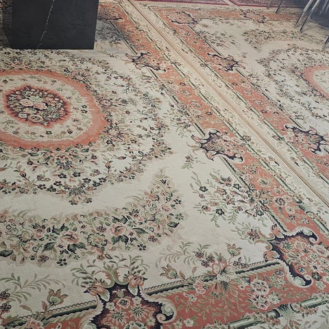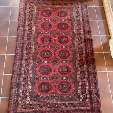 Nydelig gulvteppe i god kvalitet. Varme farger i rødt, sort og lys beige. Teppet er tungt og må hentes.