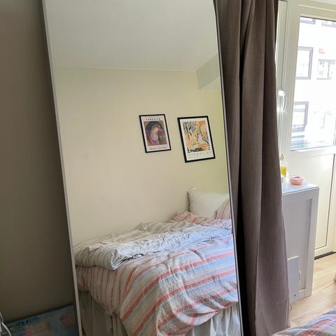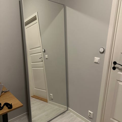 IKEA speil med mål på 78 cm i bredde og 196 cm i høyde. Dybde 5 cm.
