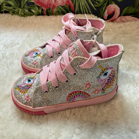 Dus rosafarge. Converse unicorn sko, enkle å ta på med borrelås og fleksible lisser. Masse bruk igjen. Har også lignende par til tvillingjente. Se mine andre annonser.