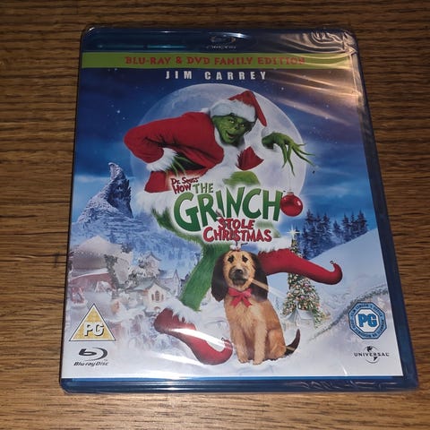 Universal The Grinch Blu-ray med originalfilm og ekstramateriale. Inkluderer filmens spesifikasjoner og tekniske detaljer på baksiden av omslaget. Passer for aldersgruppen 7 år og oppover.