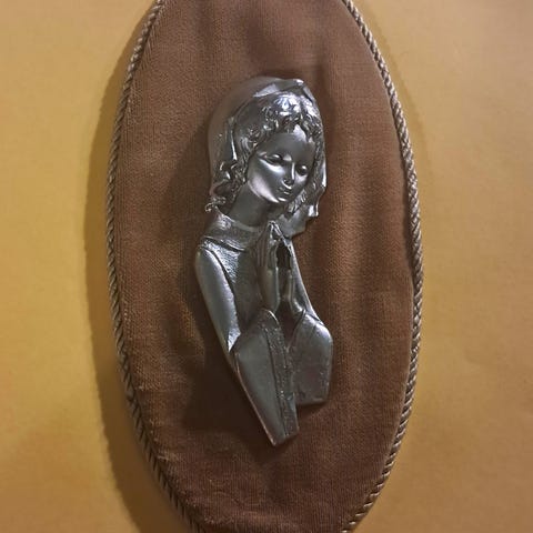Vintage, vegghengt figur i tinn festet på plate trukket i fløyel.