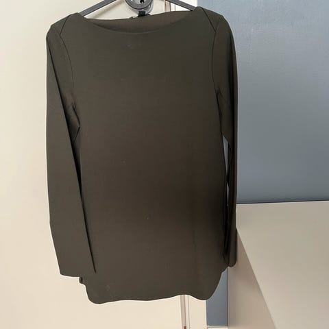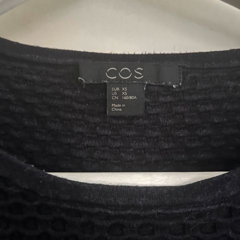 COS Genser i størrelse XS for kvinner, svart farge. Genseren har plisserte detaljer på ermene med kontrastfarge i hvitt. Materialet består av 60% viskose, 30% polyamid og 10% elastan.