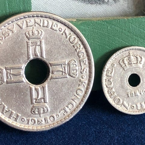 4 norske hull mynter i nær ubrukt kvalitet, ligger i folder med plastkapsler.