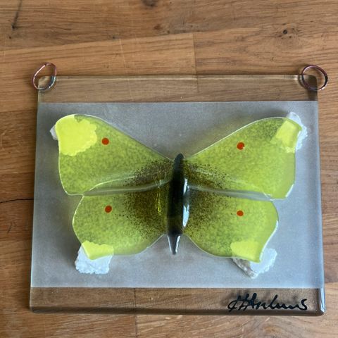 Vakker glitende sommerfugl i krystall med gullfargede metalldetaljer i nesen og antennene.