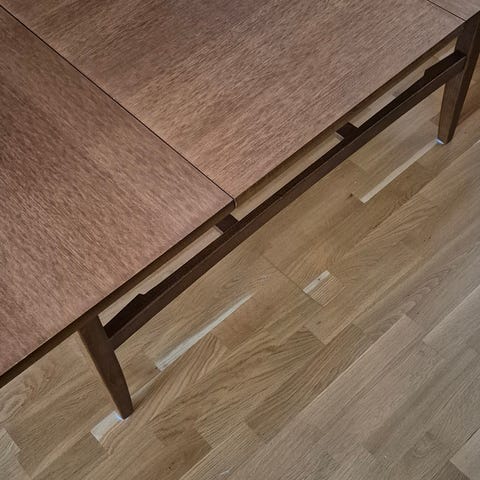 Norskprodusert P.S. Heggen stuebord i tre, med lemmer. Bordet blir 160cm bredt med lemmene ute