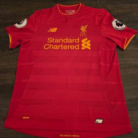 New Balance Liverpool fotballdrakt i rød farge, størrelse L for herre. Laget av polyestermateriale. Drakten har detaljer som klubblogo og sponsortrykk, samt signatur på innsiden av kragen.