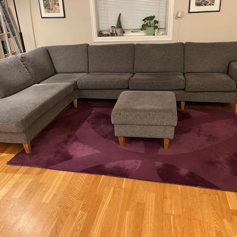 Natuzzi hjørnesofa med sjeselong på høre side. Målene på sjeselongen er 225 cm i lengden er den 293. Høyde til ryggpute er 104 og høyden er 78 og bredde på armlene er 97. Dybde sete er 56. Seteputene er festet med glidelås. Det er som vist noe slitasje på sofaen, men den er fortsatt veldig god. Det er løsnet litt fra sponplaten, men det har ingen betydning for bruk av sofaen. Bena er i mørkt tre.