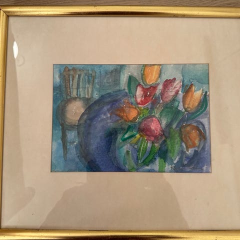 Maleri som viser en kvinne med rødoransje hår og en gul fugl. Kvinnen har på seg en oransje kjole med mønster i lilla og rødt. Bakgrunnen er blå med grønne og oransje elementer. Bildet er innrammet i en svart ramme med passepartout.